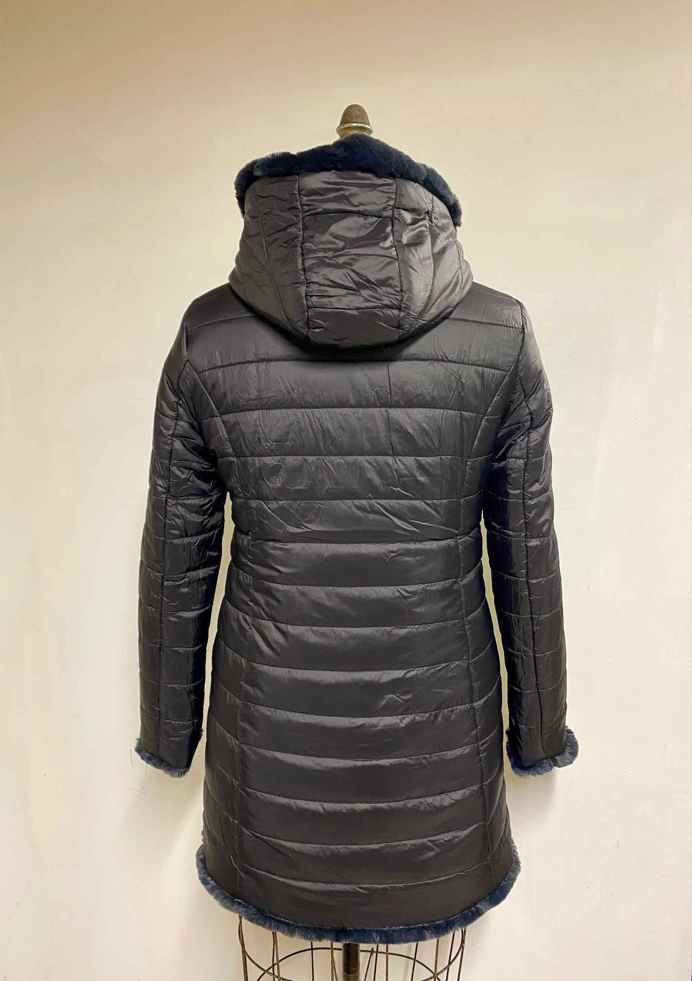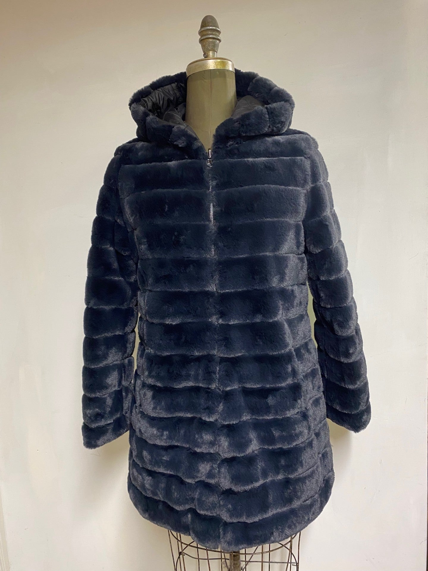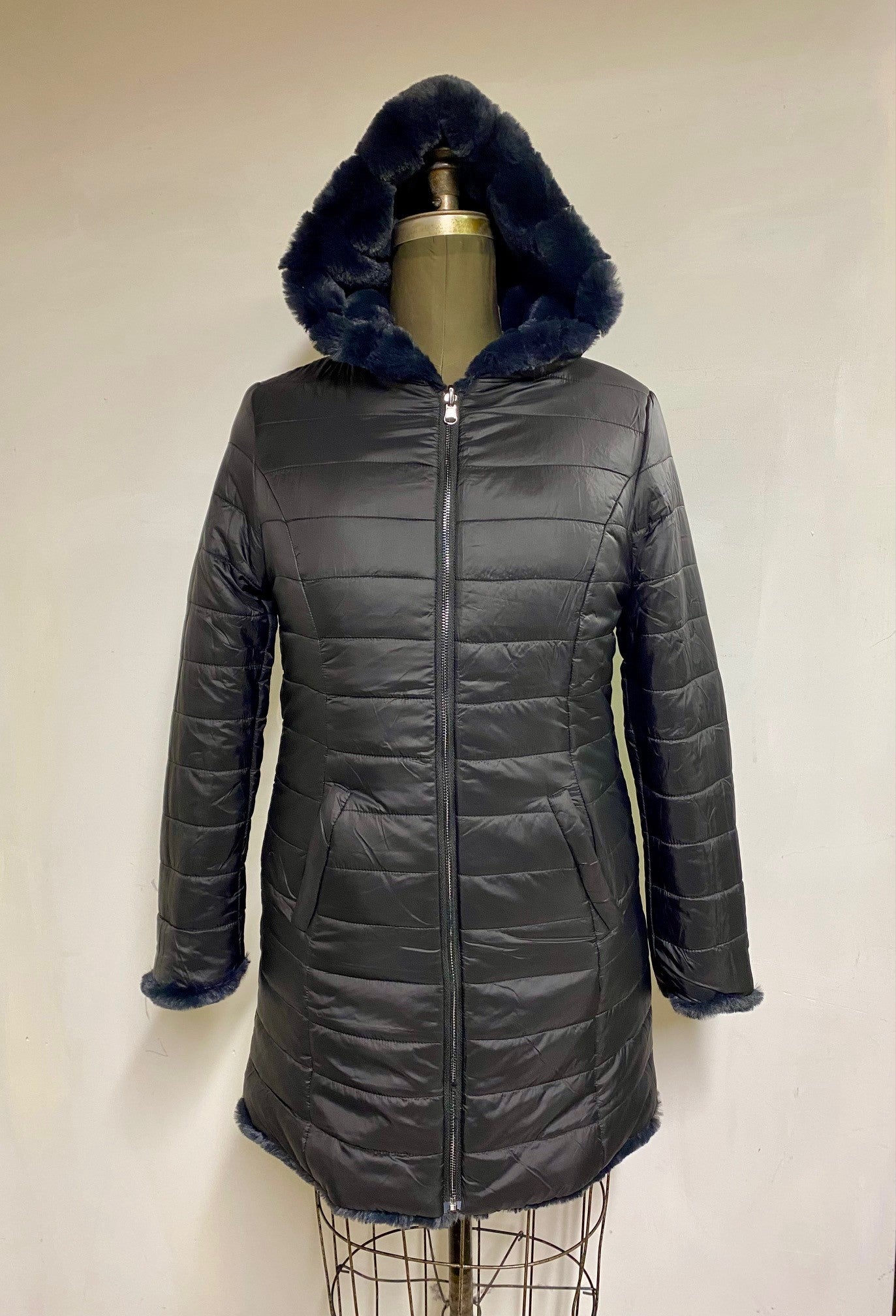 Wrap yourself in elegance and warmth with this luxurious black car coat, crafted from ultra-soft faux sheared mink fur. Designed for both style and versatility, this reversible coat offers two sophisticated looks in one—perfect for transitioning from day to night. The car coat length provides just the right amount of coverage for cooler weather, while the plush texture and sleek silhouette make it a timeless wardrobe staple. Warm, cruelty-free, and effortlessly chic.